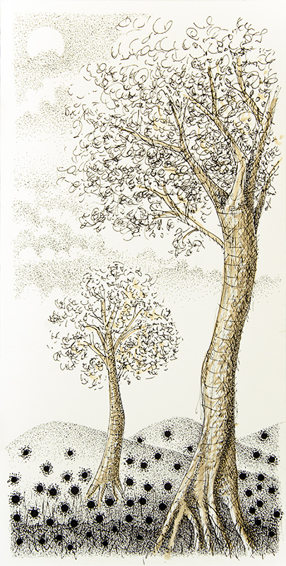 "Dancing Trees" by Rafael Gallardo. India ink & wood stain on cotton board. 8" x 16"