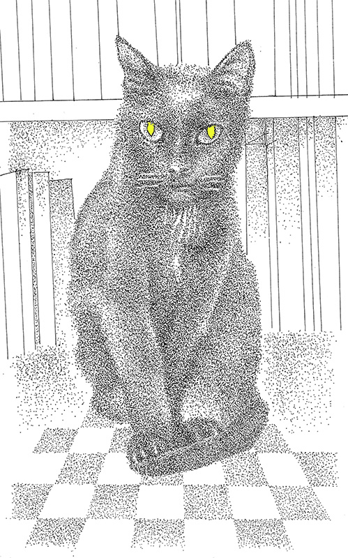 "Intellectual Cat" by Rafael Gallardo. India ink on board. 7" x 10".